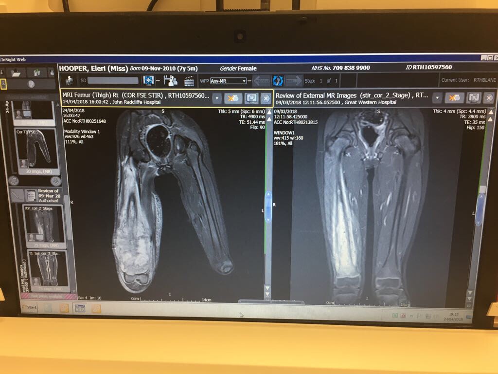 The last two weeks have see significant changes to Eleri’s treatment plan. After being admitted with a painful infection, it became obvious that the discomfort wasn’t necessarily completely confined to inflammation of tissue or necrosis associated with the death of cancer cells after chemotherapy. Her leg, or more specifically the tumour seemed to be getting bigger. On Tuesday 24 April they performed an MRI under general aesthetic. Our worst fears were confirmed – the tumour had continued to grow, it was almost at her hip and it hadn’t responded to the first two drugs of the chemotherapy protocol. Osteosarcoma is an aggressive form of cancer, but no one could have predicted the rapid acceleration in growth of Eleri’s tumour. We were told that she needed surgical intervention, but the oncologists were not sure what that intervention might be; it become clear that she might be heading for amputation. It took two days for a decision to be made on the exact surgery and treatment needed.
